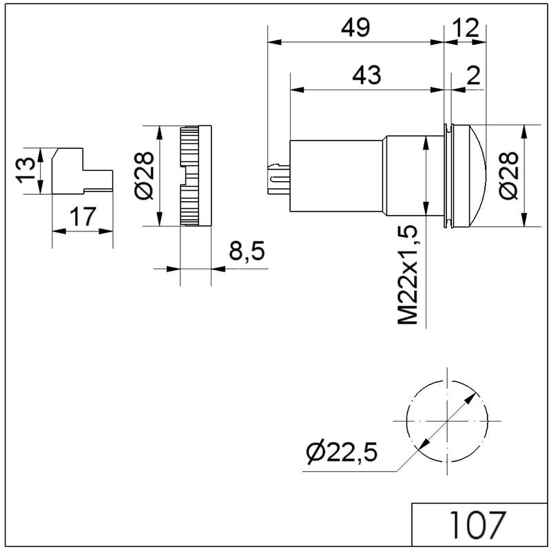 Ronfleur électronique EM pulsé; Tension: 115VAC/DC; Volume sonore: 80dB/10cm; Type de son: pulsé; Fréquence du son: env. 3200Hz; Raccordement: emboîtement avec raccordement à visser; Fixation: insertion; Diamètre: 28 mm; Couleur: noir; Catégorie de protection: IP65; Plage de température: -20°C...+50°C; Série: 107