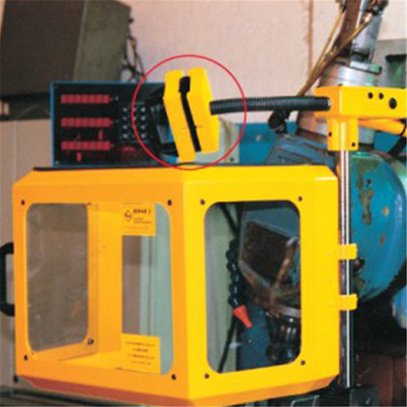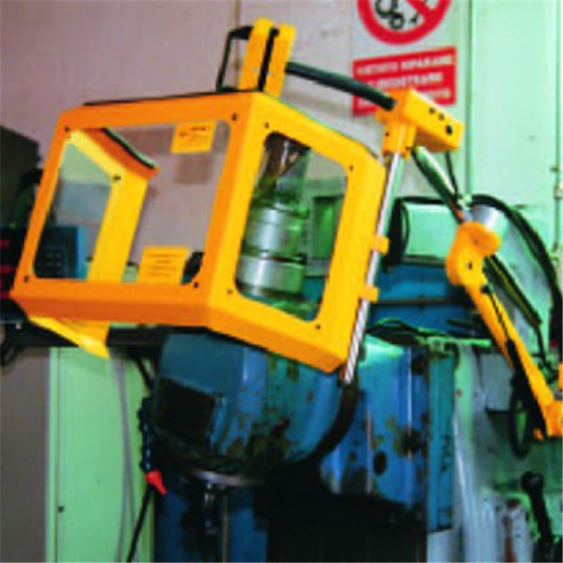 Protection pour fraiseuses avec micro-interrupteur de sécurité triple, monté sur bras articulé, avec articulation en tube d’acier, équilibré et soutenu par ressort à gaz, avec écran en acier et polycarbonate.