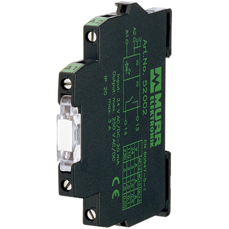 Module-relais, 24 V DC, relais de sortie, 1 contact NO; Mode de commutation: 1 contact NO; Tension d'alimentation: 24 V AC/DC; Raccordement: Bornes à vis; Mode de fixation: à enclipser sur rail DIN (EN 60715); Plage de température: -20...+55 °C; Dimensions H × L × P: 91×6.2×70 mm; Indicateur à LED: LED (verte)