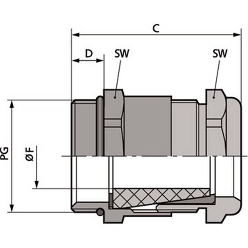 Presse-étoupe PG d'étanchéité spéciale pour températures élevées, résistant aux huiles, aux acides et aux produits chimiques; Système de raccord vissé: Passage simple; Type de filetage: PG; Dimension: 9; Matière: Laiton; Ø F mm: 5,8 - 6,8; Taille de clé SW: 17; Longueur totale, C mm: 28.5; Longueur de filetage D mm: 6; Indice de protection: IP 68 - 10 bar; Température ambiante: -15 ... 200 °C; Homologations-Normes: CE; Pièces / conditionnement: 50; Série: SKINDICHT® SHV FKM