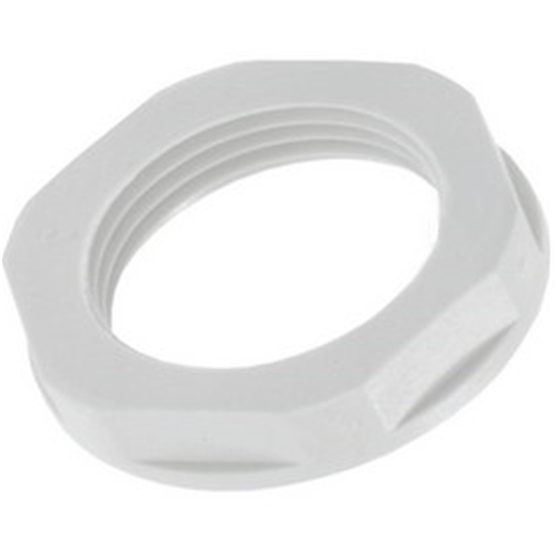 Contre-écrous renforcés par fibre de verre, pour une stabilité mécanique maximale, pour le verrouillage dans les orifices sans filetage; Système de raccord vissé: Passage simple; Type de filetage: PG; Dimension: 13,5; Matière: Polyamide; Propriétés: Renforcé par fibre de verre; Couleur: Gris clair (RAL 7035); Taille de clé SW: 27; Température ambiante: -20 ... 100 °C; Homologations-Normes: CE / RU; Pièces / conditionnement: 100; Série: SKINTOP® GMP-GL