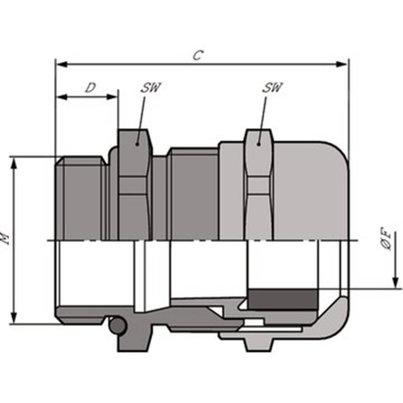Presse-étoupe en laiton pour des diamètres de câble jusqu'à 98 mm, dans les zones où la stabilité mécanique et chimique est critique; Système de raccord vissé: Passage simple; Type de filetage: Métrique; Dimension: 75x1,5; Matière: Laiton; Plage de serrage ØF: 58 - 68.0 mm; Taille de clé SW: 95; Longueur totale, C: 105 mm; Longueur de filetage D: 15 mm; Indice de protection: IP 68; Homologations-Normes: CE / CULUS / VDE / cRUus / DNV; Pièces / conditionnement: 1; Série: SKINTOP® MS-M