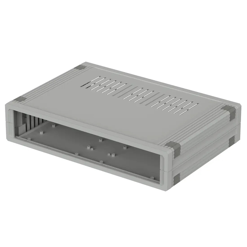 Boîtier avec fentes d'aération dans la partie supérieure et la partie inférieure; Dimensions: 290.9 x 198.9 x 62.2 mm; Coloris: Gris clair, analogue à RAL 7035; Type de protection: IP 30 ; Matériau du boîtier: ABS; Fourniture: 2 demi-coquilles, 8 caches, 4 pieds en caoutchouc, 4 vis.; Série: Ultramas