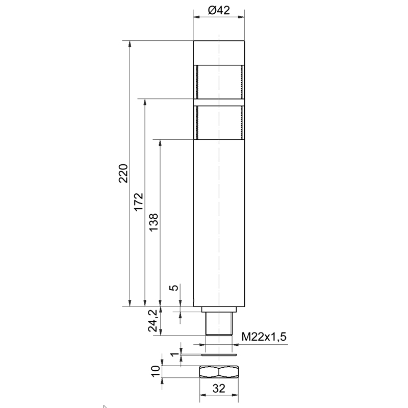 Mât de signalisation deSIGN42; Alimentation: 24V DC +/- 10%; Source de lumière: LED; Forme du signal: Fixe; Couleur de lumière: Rouge, Vert; Couleur de la calotte: Clair; Type de fixation: Montage encastré; Raccordement: Câble 2 m; Diamètre: 42 mm; Hauteur: 226 mm; Couleur du boîtier: Argenté; Matériaux: Inox, PC; Indice de protection: IP65; Température de service: -20°C ... +50°C