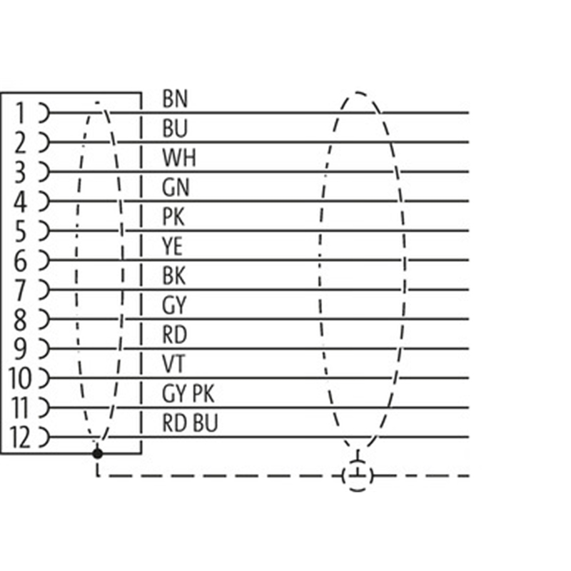 Connecteur / Câble de raccordement; Type: Câble de connexion, M12 x 1; Raccordement A: Connecteur M12, femelle, coudé, 12 pôles, codé-A; Raccordement B: Extrémité de câble libre; Câble: 3.00 m, PUR (UL/CSA), 12 fils (12 x 0.14 mm²), noir; Blindage: Oui; Compatible chaines porte-câbles: Oui, (5 Mio.) @ 25 °C; Matériau de la tête: PUR, noir; Matériau verrouillage: Zinc moulé, nickelé; Tension de service max.: 30 VAC / 30 VDC; Tension de service max. (listé UL): 30 VAC / 30 VDC; Courant de service max. par contact: 1,5 A; Degré de protection: IP65, IP66K, IP67 (EN CEI 60529); Température de service: -25 °C ... 85 °C; Température de service: (statique): -40 °C ... 80 °C; Température de service (dynamique): -25 °C ... 80 °C