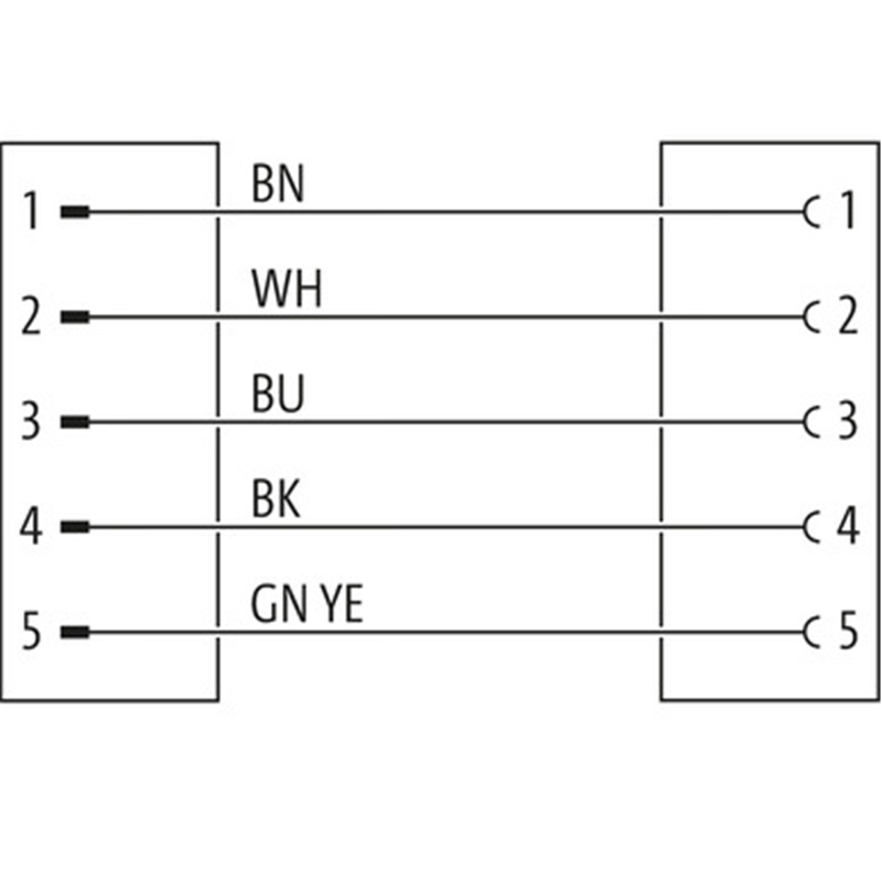 Connecteur / Câble de raccordement; Type: Câble de connexion, M12 x 1 / M12 x 1; Raccordement A: Connecteur M12, mâle, droit, 5 pôles, codé-A; Raccordement B: Connecteur M12, femelle, droit, 5 pôles, codé-A; Câble: 0.60 m, PVC, 5 fils (5 x 0,34 mm²), noir; Blindage: Non; Compatible chaines porte-câbles: Non; Matériau de la tête: PUR, noir; Matériau verrouillage: Zinc moulé, nickelé; Tension de service max.: 125 VAC / 125 DC; Courant de service max. par contact: 4 A; Degré de protection: IP65, IP66K, IP67 (EN CEI 60529); Température de service: -30 °C ... 85 °C; Température de service: (statique): -30 °C ... 80 °C ; Température de service (dynamique): -5 °C ... 80 °C