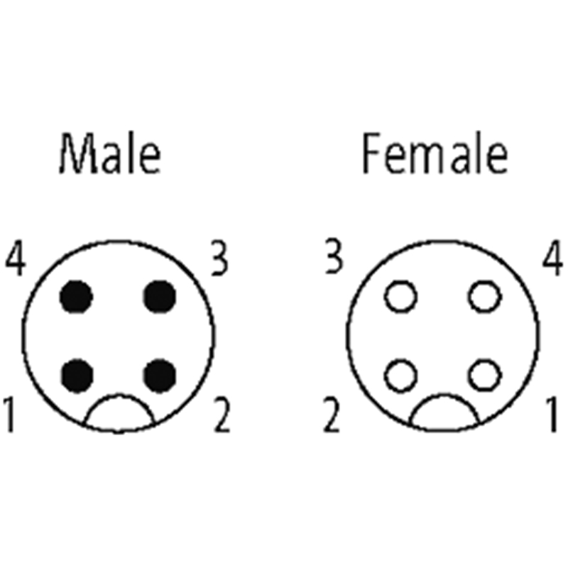 Connecteur / Cable de raccordement; Type: Câble de connexion, M12 x 1 / M12 x 1; Raccordement A: Connecteur M12, femelle, droit, 4 pôles, codé-A; Raccordement B: Connecteur M12, mâle, droit, 4 pôles, codé-A; Câble: 1,00 m, PUR, 4 fils (4 x 0,34 mm², gris; Blindage: Blindé; Compatible chaines porte-câbles: Oui (0.1 Mio. @ 25 °C); Matériau verrouillage: Zinc moulé, nickelé; Tension de service: 60 VAC / 60 VDC; Courant de service max. par contact: 4 A; Indice de protection: IP67, IP65 (EN CEI 60529); Température de service: -30 °C ... 85 °C; Température de service: (statique): -30 °C ... 80 °C; Température de service: (dynamique): -5 °C ... 70 °C