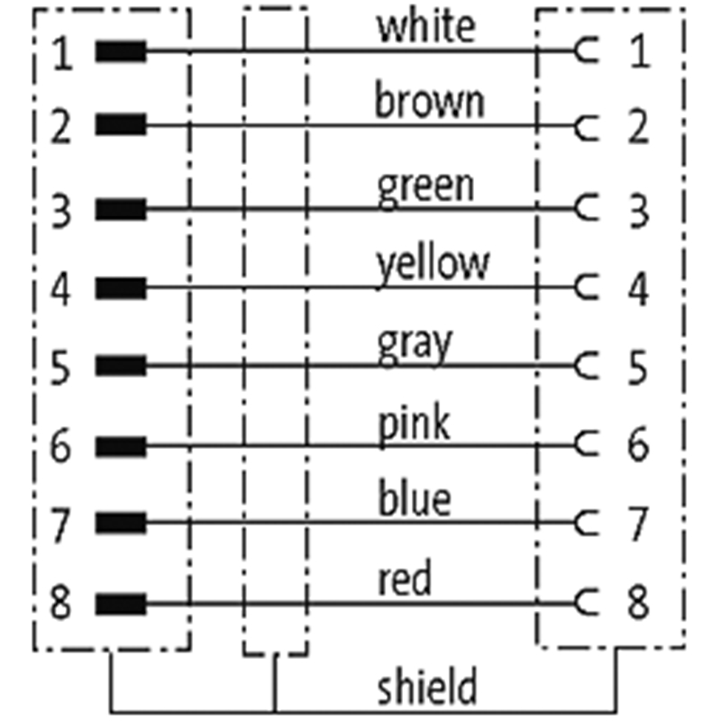 Connecteur / Câble de raccordement; Type: Câble de connexion, M12 x 1 / M12 x 1; Raccordement A: Connecteur M12, femelle, droit, 8 pôles, codé-A; Raccordement B: Connecteur M12, mâle, droit, 8 pôles, codé-A; Câble: 25.00 m, PUR (UL/CSA), 8 fils (8 x 0,25 mm²), gris; Blindage: Blindé; Compatible chaînes porte-câbles: Oui (5 Mio.), 5 m/s²; Tension de service: max. 30 V AC/DC; Courant de service par contact: max. 2 A; Degré de protection: IP65, IP66K, IP67 (EN 60529); Plage de températures (fixe): -40...+80 °C; Plage de températures (mobile): -25...+80 °C
