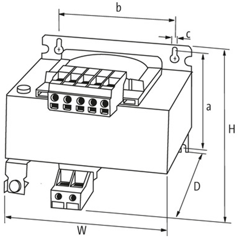 Transformateur monophasé de commande et de séparation; Puissance nominale: 500 VA; Tension d’entrée: 400 V AC ±5%; Fréquence: 50...60 Hz; Tension de sortie: 110 V AC; Classe d’isolement: T 40/B; Mode de raccordement: Bornes à vis; Dimensions (H x L x P): 110 x 150 x 144 mm; Cotes de fixation (a x b x c): 88 x 122 x 7 mm; Ø perçage: 7 x 11 mm; Mode de fixation: Fixation par trou de serrure; Degré de protection: IP20; Plage de température: -20...+40 °C; Série: MET