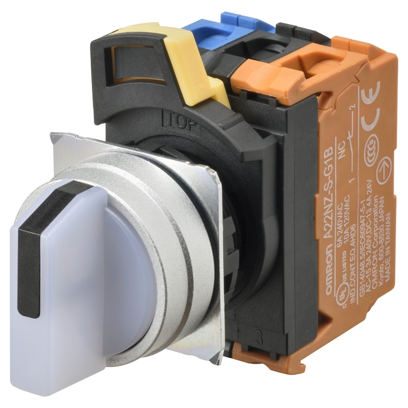 Bouton-poussoir A22NW Ø22, 2 positions, Lumineux, lentille Métal brossé métal, AUTO RESET ON Gauche, Couleur Blanc, DEL Jaune, 2NF, 24 VDC