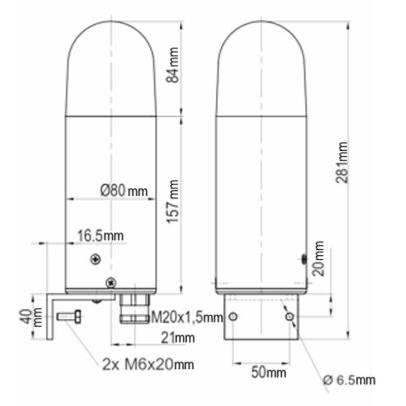 Feu à LED multimodes; Mode d'Eclairage: Clignotant, Fixe, Flash ; Type d'Eclairage: LED; Puissance lumineuse en Joules: 15 Joules; Puissance lumineuse en candelas: 75 cd; Fréquence du flash: 0,1/0,5/0,75/1/2 Hz ; Couleur d'optique: Rouge; Tension d’alimentation: 115/230Vca/Vcc ; Dimensions: Ø 80 x 242 mm; Matériau du boîtier: Aluminium anodisé; Matériau de l'optique: Polycarbonate; Fixation: Montage en saillie ; Entrée de câble: 1 x M20; Indice de protection: IP54; Température d'utilisation: -40 à +55°C; Température de stockage: -40 à +70°C; Consommation nominale: 50 mA en 230 Vca - 1Hz (Flash); Série: ABLED