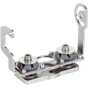 Équerre et plaque de fixation; Description: Équerre de fixation avec amortisseur de chocs/vibrations intégré pour montage du lecteur par ex. sur un chariot élévateur à fourche (montage côté droit dans la direction du déplacement); Convient pour: CLV69x