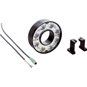 Éclairage; Description : Kit d'éclairage circulaire, champ clair pour ICR84x-2L, couleur d'éclairage rouge, distance d'éclairage 0,2 m à 1 m, comprenant équerre de montage, vis et câble de raccordement (2 m); Classe LED : Groupe de risque 1 (risque faible, IEC62471 : 2006); Température de fonctionnement : 0...