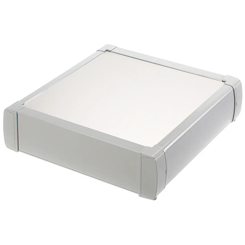 Aluplan AP 10.... – jeu de profilés pour boîtier; Coloris: Gris clair, analogue à RAL 7035; Coloris: Gris clair; Classe de protection: IP65; Matériau de boîtier :; Profilés extrudés: Al Mg Si 0,5 peints par poudrage; pièces d'angle coulées sous pression: Zn-coulé sous pression ZnAl 4 Cu 1, peint par poudrage; caches d’angle: PA-GF 15, joint pour pièce d’angle TPV/TPE; cordon en caoutchouc cellulaire (EPDM) dans la rainure de profilé; Fourniture: 2 profilés frontaux, joint inclus, 2 profilés latéraux, joint inclus, 4 pièces d'angle injectées, 4 joints pour pièces d'angle, 4 caches, 16 vis, 4 pieds en caoutchouc; Dimensions: 378 x 378 x 100 mm; Série: Aluplan