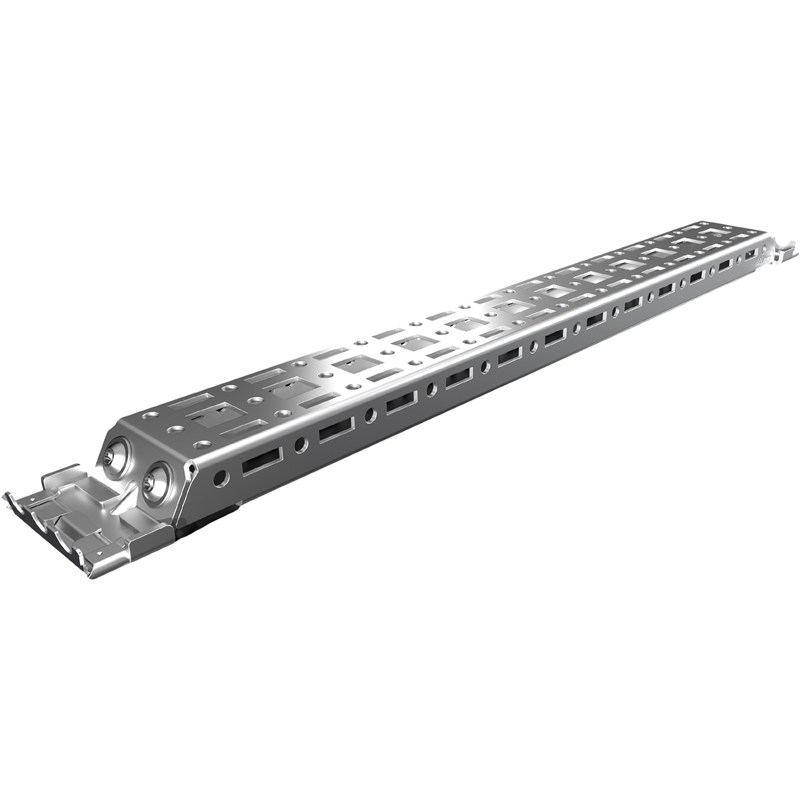 Pour le montage dans le coffret, sans perçage. Le montage s'effectue sur les bossages présents dans les coffrets au niveau de ses parois latérales, de sa base et de son toit. Dotés de deux rangées de perforations, ces rails fournissent une surface de montage supplémentaire pour p. ex. : rails de montage 14 x 39 mm, lampes pour armoires électriques, contact de porte, blocages de porte, supports de goulotte souple.