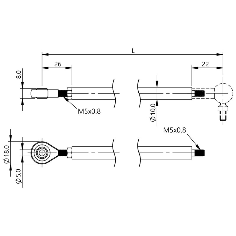 Tige articulée pour modèle profilé; Matériau: Aluminium anodisé; Dimensions: Ø 10 x 150 mm; Fixation: Œil Ø 5H7 / connecteur mâle M5x0,8