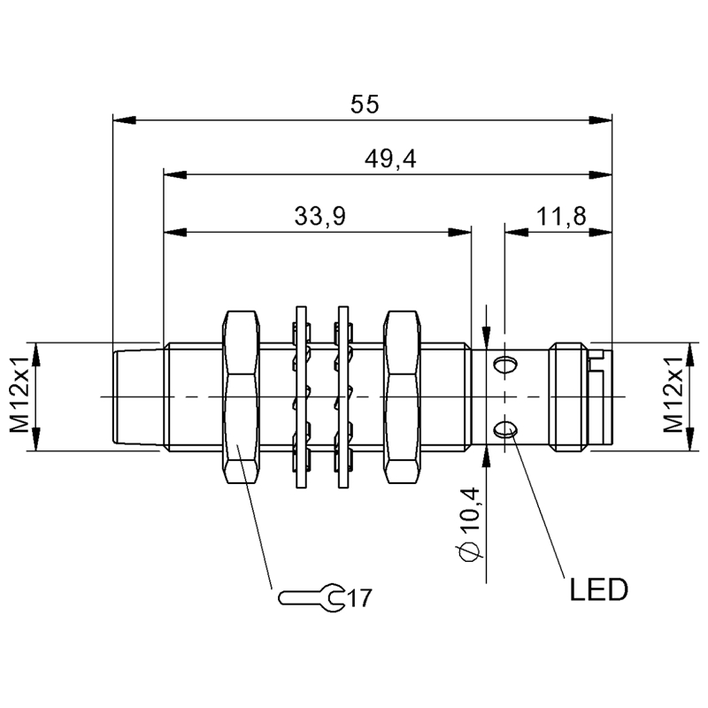 Capteur de distance inductif; Format: Cylindrique fileté, M12 x 1; Plage de mesure: 0,2...7 mm ; Montage: Non noyable; Sortie analogique: Courant 4...20 mA ; Caractéristique de sortie: Décroissant à l'approche ; Fréquence limite –3 dB: 1000 Hz; Fidélité de répétition selon BWN: ±7 µm ; Écart de linéarité max.: ±70 µm ; Raccordement: Connecteur mâle M12, 4 pôles, codé-A; Tension d'emploi Ub: 16-30Vdc ; Diamètre: Ø 12 mm; Longueur totale du boîtier: 55 mm ; Longueur de filetage utile: 33.9 mm; Matériau du boîtier: Laiton, revêtement sans nickel ; Face sensible, matériau: LCP; Classe de protection: IP68; Température ambiante: -40...80 °C ; Homologation / conformité: CE, UKCA, cULus, WEEE