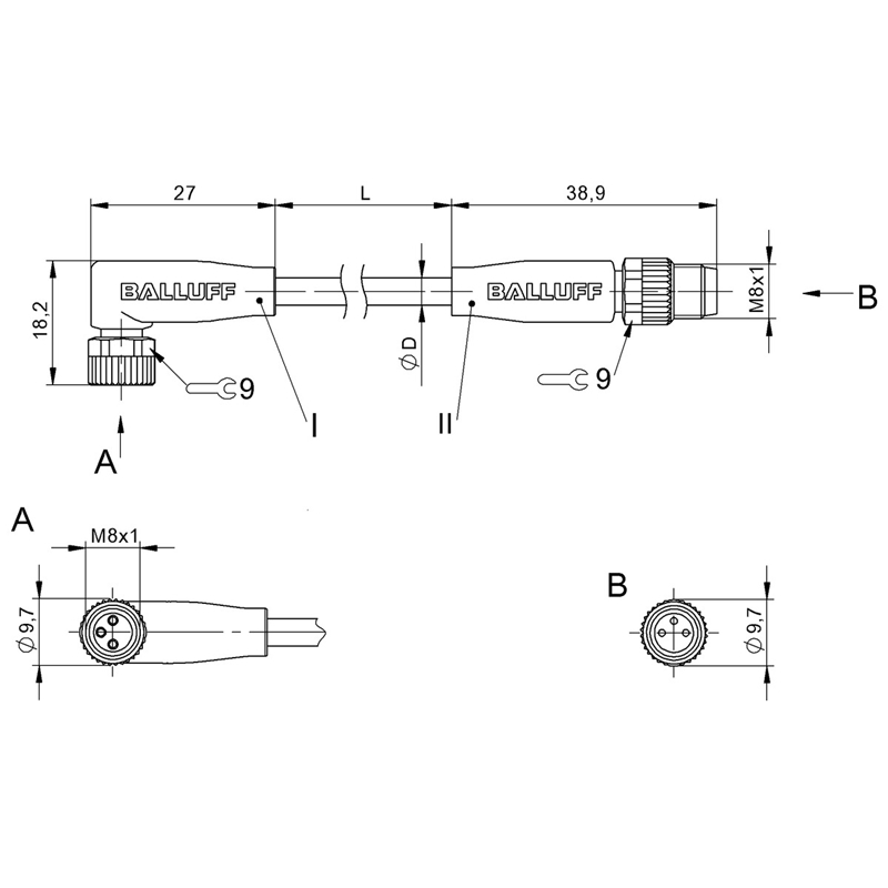 • Raccordement B: Connecteur M8, femelle, coudé, 3 pôles