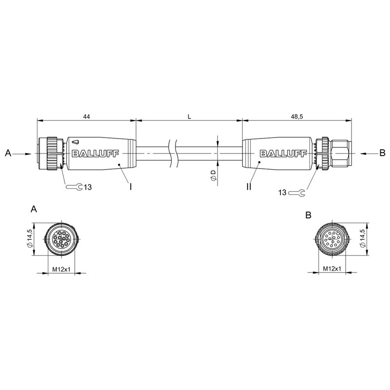 Connecteur / Câble de raccordement; Type: Câble de connexion, M12 x 1 / M12 x 1; Raccordement A: Connecteur M12, femelle, droit, 12 pôles, codé-A; Raccordement B: Connecteur M12, mâle, droit, 12 pôles, codé-A; Câble de liaison: Câble PUR, 0.30 m, 12 fils (12 x 0.25 mm²); Compatible chaîne porte-câble: Oui (2 MM); Courant nominal (40 °C): 1.5 A; Tension d'emploi Ub: 30 VDC / 30 VAC; Classe de protection: IP68/IP68; Température ambiante: -25…80 °C; Température de câble, chaîne porte-câble: -25…60 °C; Température de câble, pose fixe: -50…80 °C; Température de câble, pose flexible: -25…80 °C