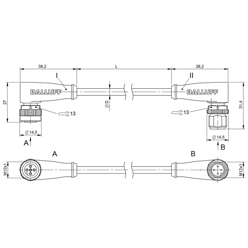 • Raccordement B: Connecteur M12, mâle, coudé, 4 pôles, codé-A