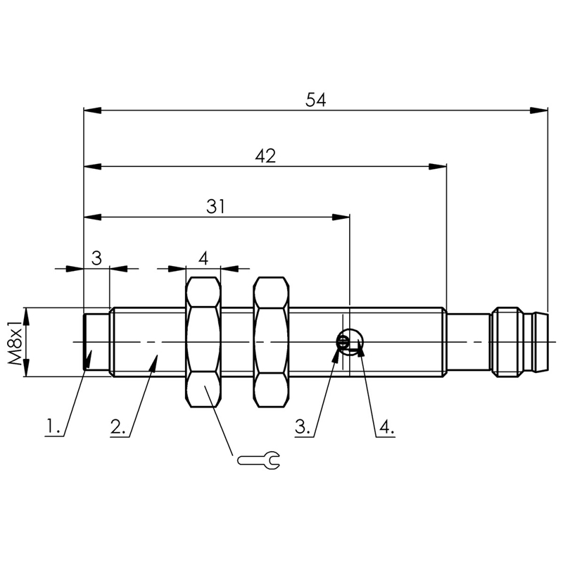 Capteur de proximité capacitif; Format: Cylindrique fileté, M8 x 1; Portée nominale Sn: 3.00 mm (0.1...3 mm); Montage: Non noyable; Sortie de commutation: PNP; Type de commutation: Contact à fermeture (NO); Fréquence de commutation: 100 Hz; Raccordement: Connecteur mâle M8 3 pôles; Tension d'alimentation: 11-30Vdc; Diamètre: Ø 8 mm; Longueur totale du boîtier: 54 mm; Longueur de filetage utile: 39 mm; Matériau du boîtier: Acier inoxydable (1.4301); Face sensible, matériau: PTFE; Classe de protection: IP65 (CEI 60529); Température ambiante: -10...70 °C; Homologation / conformité: CE, cULus, WEEE; Série: M08T4E2