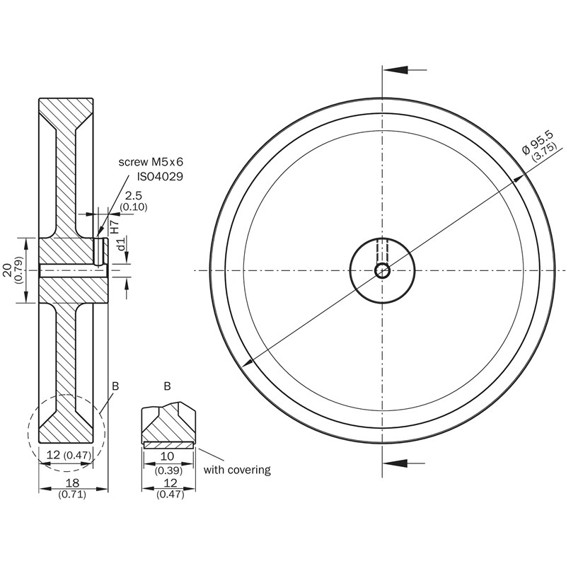 Roue de mesure et système de roue de mesure; Description : Roue de mesure en aluminium avec surface en polyuréthane cannelée pour axe saillant 10 mm, circonférence 300 mm; Température de service: –30 °C +80 °C