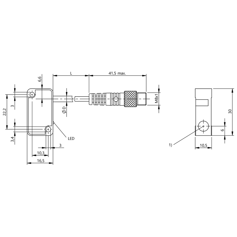 Capteur de proximité inductif; Format: Parallélépipédique; Version électrique: 3 fils DC; Portée Sn: 2.00 mm; Montage: Noyable; Sortie de commutation: PNP; Type de commutation: Contact à ouverture (NF); Fréquence de commutation: 2500 Hz ; Interface de communication: -; Raccordement: Câble avec connecteur mâle M8, 3 pôles, 0,32 m, PUR ; Tension d'emploi Ub: 10-30Vdc; Dimensions: 30 x 10.5 x 16.5 mm; Matériau du boîtier: PBT, GF20 ; Face sensible, matériau: PBT, GF20 ; Classe de protection: IP65 ; Température ambiante: -25...70 °C ; Homologation / conformité: CE, UKCA, cULus, WEEE