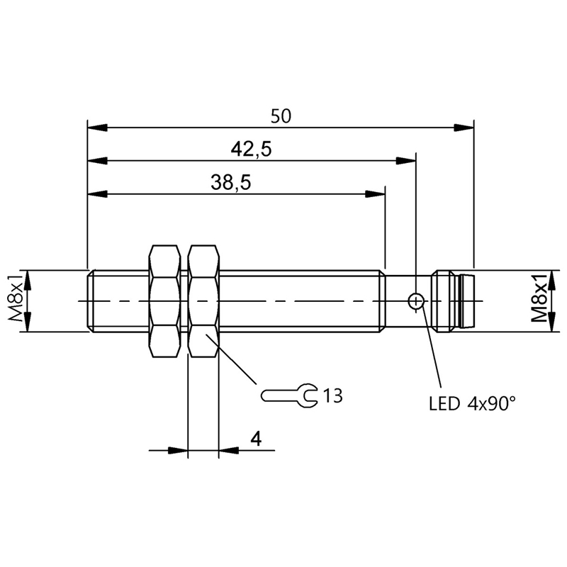 Capteur de proximité inductif résistants a la haute pression ; Format: Cylindrique fileté, M8 x 1; Version électrique: 3 fils DC; Portée Sn: 2.00 mm; Montage: Noyable; Sortie de commutation: PNP; Type de commutation: Contact à fermeture (NO); Fréquence de commutation: 100 Hz; Raccordement: Connecteur mâle M8, 3 pôles; Tension d'alimentation: 10-30Vdc; Diamètre: Ø 8 mm; Longueur totale du boîtier: 50 mm; Longueur de filetage utile: 38.5 mm; Matériau du boîtier: Acier inoxydable (1.4404); Face sensible, matériau: Acier inoxydable (1.4404); Classe de protection: IP67 (CEI 60529); Température ambiante: -25...70 °C; Résistance à la pression max.: 50 bar; Homologation / conformité: CE, cULus, WEEE, UKCA