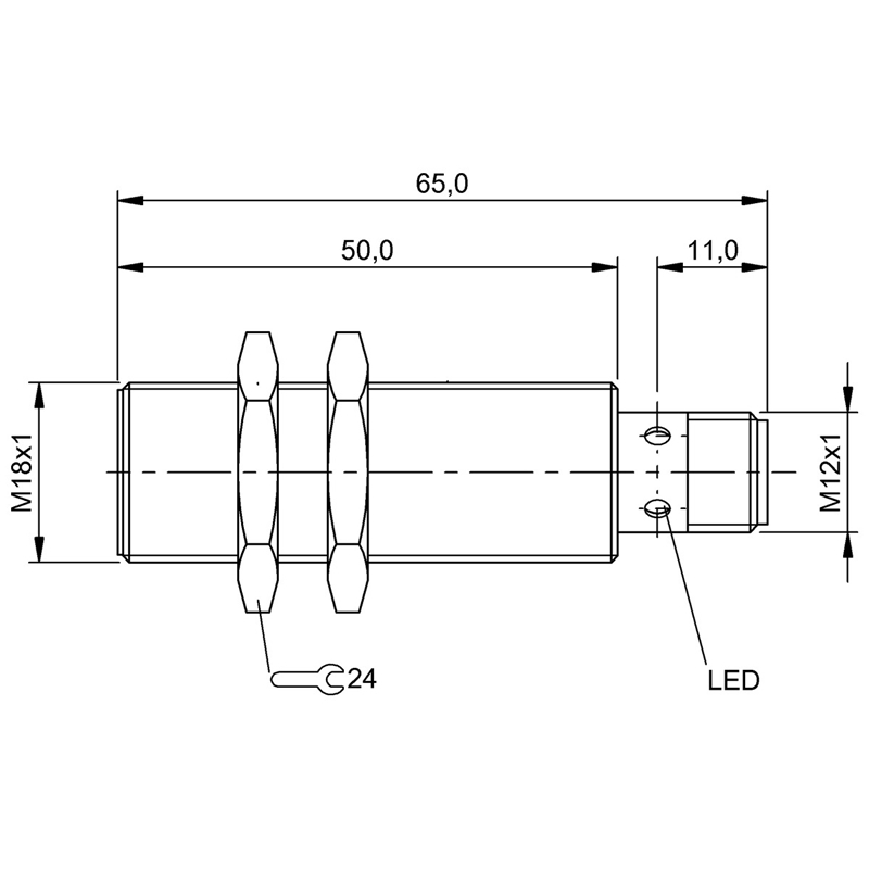 Capteur de proximité inductif hygiénique; Format: Cylindrique fileté, M18 x 1; Version électrique: 3 fils DC; Portée Sn: 8.00 mm; Montage: Noyable; Sortie de commutation: PNP; Type de commutation: Contact à ouverture (NF); Fréquence de commutation: 700 Hz; Raccordement: Connecteur mâle M12 4 pôles; Tension d'alimentation: 10-30Vdc; Diamètre: Ø 18 mm; Longueur totale du boîtier: 65 mm; Longueur de filetage utile: 50 mm; Matériau du boîtier: Acier inoxydable (1.4571); Face sensible, matériau: PEEK; Classe de protection: IP68; Température ambiante: -40...85 °C
