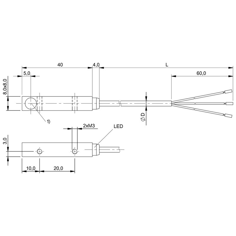 Capteur de proximité inductif; Format: Parallélépipédique; Version électrique: 3 fils DC; Portée Sn: 2.00 mm; Montage: Noyable; Sortie de commutation: PNP; Type de commutation: Contact à fermeture (NO); Fréquence de commutation: 3000 Hz; Interface de communication: -; Raccordement: Câble, 3.00 m, PUR; Tension d'alimentation: 10-30Vdc; Dimensions: 40 x 8 x 8 mm; Matériau du boîtier: Zinc, coulé sous pression; Face sensible, matériau: PBT; Classe de protection: IP67 (CEI 60529); Température ambiante: -25...70 °C