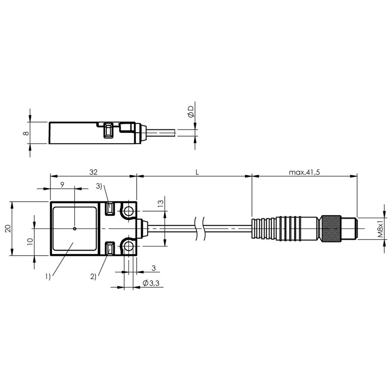 Capteur de proximité inductif; Format: Parallélépipédique; Version électrique: 3 fils DC; Portée Sn: 7.00 mm; Montage: Noyable; Sortie de commutation: PNP; Type de commutation: Contact à fermeture (NO); Fréquence de commutation: 150 Hz; Raccordement: Câble 0,3 m PUR avec connecteur mâle M8 3 pôles; Tension d'alimentation: 10-30Vdc; Dimensions: 20.0x8.0x32.0 mm; Matériau du boîtier: Zinc, coulé sous pression; Classe de protection: IP67 (CEI 60529); Température ambiante: -25...70 °C