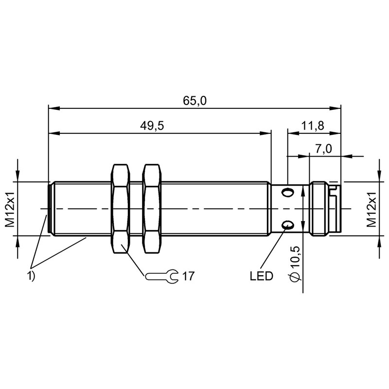 Capteur de proximité inductif résistant à la haute pression; Format: Cylindrique fileté, M12 x 1; Version électrique: 3 fils DC; Portée Sn: 4.00 mm; Montage: Noyable; Sortie de commutation: PNP; Type de commutation: Contact à fermeture (NO); Fréquence de commutation: 500 Hz; Raccordement: Connecteur mâle M12 4 pôles; Tension d'alimentation: 10-30Vdc; Diamètre: Ø 12 mm; Longueur totale du boîtier: 65 mm; Longueur de filetage utile: 49,5 mm; Matériau du boîtier: Acier inoxydable; Face sensible, matériau: Acier inoxydable; Classe de protection: IP67 (CEI 60529); Température ambiante: -25...70 °C; Résistance à la pression max.: 60 bar