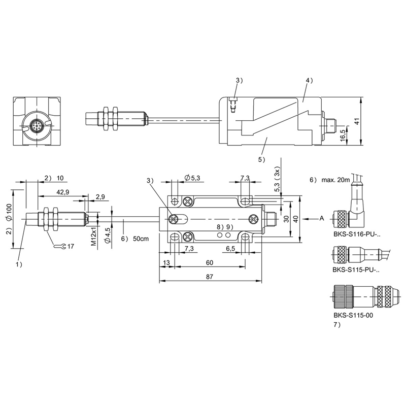 Appareil de lecture/écriture, RS232, M12x1, 53 mm, Forme d'antenne rond, Matériau boîtier CuZn nickelé