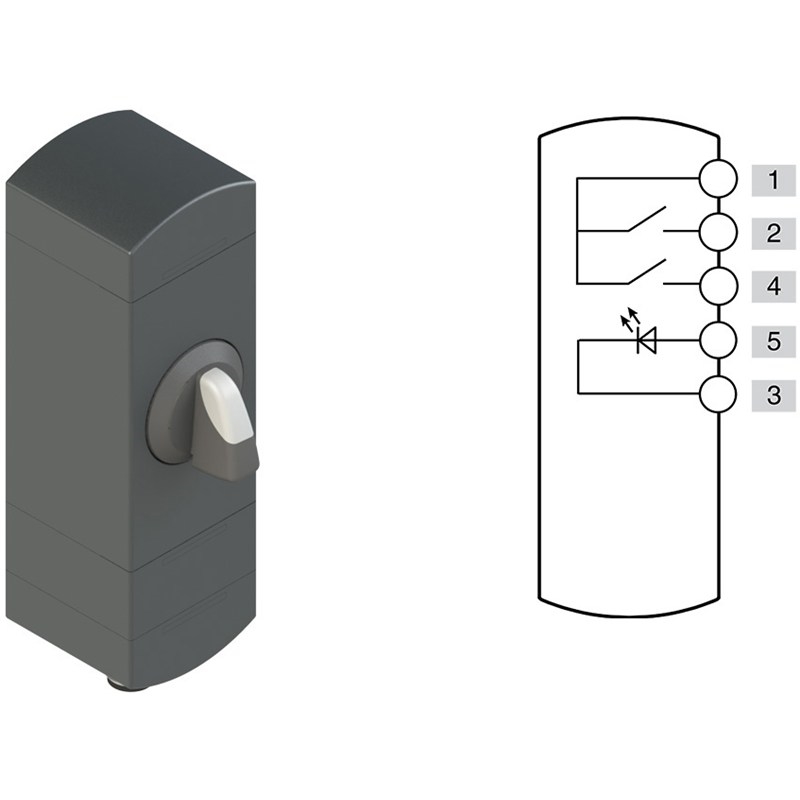 Boîtier de commande; Nombre des dispositifs: 1 dispositif; Position 1: Sélecteur à trois positions 2NO; Connexion et sens de sortie: Connecteur M12 à 5 pôles, en bas ; Degré de protection: IP65 selon EN 60529; Série: BN