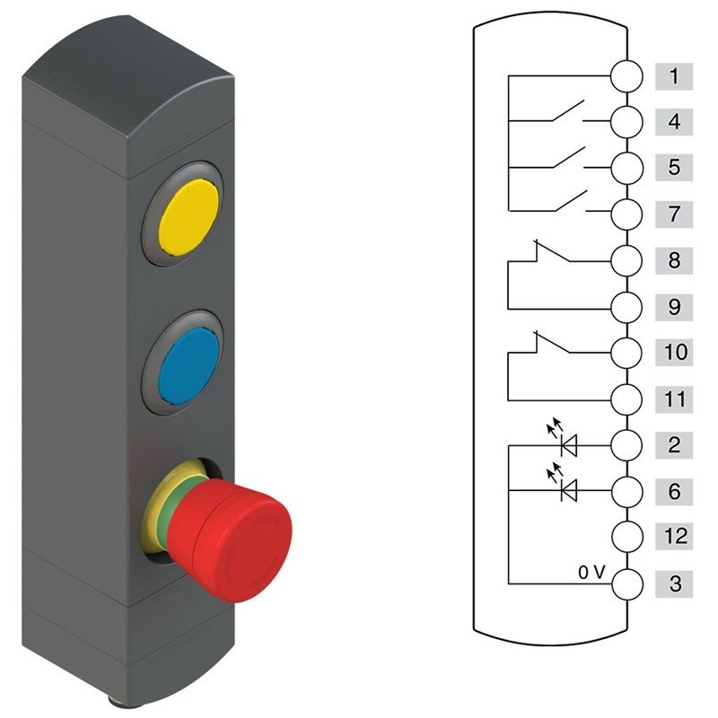 Boîtier de commande; Nombre des dispositifs: 3 dispositifs; Position 1: 1 bouton jaune 1NO; Position 2: 1 bouton bleu 1NO; Position 3: 1 bouton d’arrêt d’urgence rouge, déverrouillage par rotation, 2NC+1NO; Connexion et sens de sortie: Connecteur M12 à 12 pôles, en bas ; Degré de protection: IP65 selon EN 60529; Série: BN