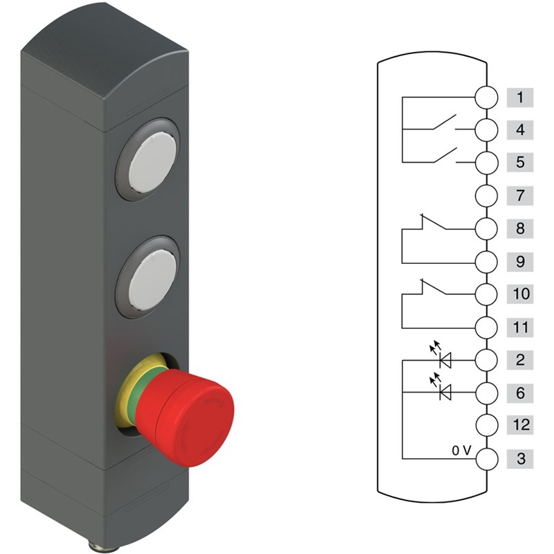 Boîtier de commande; Nombre des dispositifs: 3 dispositifs, - Position 1: 1 bouton blanc 1NO, - Position 2: 1 bouton blanc 1NO, - Position 3: 1 bouton d’arrêt d’urgence rouge, déblocage par rotation, 2NC; Connexion et sens de sortie: Connecteur M12 à 12 pôles, en bas ; Degré de protection: IP65 selon EN 60529; Série: BN