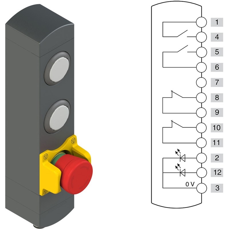 Boîtier de commande; Nombre des dispositifs: 3 dispositifs; Position 1: 1 bouton blanc 1NO; Position 2: 1 bouton blanc 1NO; Position 3: 1 bouton d’arrêt d’urgence rouge, déblocage par rotation, 2NC; Connexion et sens de sortie: Connecteur M12 à 12 pôles, en bas ; Degré de protection: IP65 selon EN 60529; Série: BN