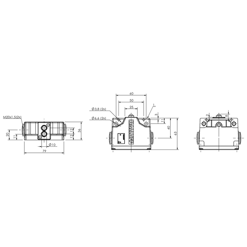 Interrupteur de position mécanique; Modèle: 61; Version: Contact à ressort; Nombre d'éléments de sortie: 2x Bille; Entraxe entre contacts: 12 mm; Principe actif: (1-2) Mécanique; Courant permanent: (1-2) 6 A; Tension d'emploi nominale Ue: (1-2) 250 VAC; Montage: Vertical; Direction d’approche: Dans l'axe longitudinal, parallèle à la surface de vissage; Vitesse d'approche: (1-2) 40 m/min; Type de raccordement: (1-2) Borne à vis; Dimensions: 79 x 36 x 63 mm ; Matériau du boîtier: Aluminium, anodisé ; Classe de protection: IP67; Température ambiante: -5...85 °C; Homologation / conformité: CE, CCC, WEEE ; Série: 819