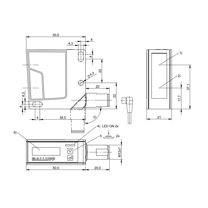Capteur de mesure de distance; Format: Parallélépipédique; Principe de détection: Directe sur l'objet; Principe du capteur: Triangulation, faisceau divergent; Portée: 50...650 mm; Précision: ±1 %; Fidélité de répétition: ± 50 µm; Résolution: max. 100 µm; Source d'émission: Laser à lumière rouge, Classe 1; Taille du spot lumineux: 1.2 x 1.2 mm at 650 mm; Sortie analogique: 4…20 mA 0…10 V; Sortie de commutation: PNP/NPN (x2); Type de commutation: Contact à fermeture/ouverture (NO/NF); Mode de commutation: Commutation claire/sombre; Fréquence de commutation: 500 Hz; Interface de communication: IO-Link 1.1; Raccordement: Connecteur mâle M12, 4 pôles, orientable; Tension d'alimentation: 18-30Vdc; Dimensions: 50 x 21 x 50 mm; Matériau du boîtier: Plastique; Classe de protection: IP67; Température ambiante: -20...50 °C; Homologation / conformité: CE, cULus, EAC, WEEE; Série: 24K