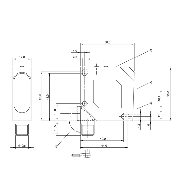 Capteur de mesure de distance; Format: Parallélépipédique; Principe de détection: Directe sur l'objet; Principe du capteur: Triangulation, faisceau divergent; Portée: 30 à 100 mm; Précision: ±0,25 % P.E.; Fidélité de répétition: 0,25 % P.E.; Résolution: 0,1 % P.E.; Réglage: Teach; Source d'émission: Laser, Lumière rouge, Classe 2; Taille du spot lumineux: 1.5 x 3.25 mm à 100 mm; Sortie analogique: Courant 4…20 mA, linéaire croissant/décroissant; Sortie de commutation: PNP (x2); Type de commutation: Contact à fermeture/ouverture (NO/NF); Mode de commutation: Commutation claire/sombre; Fréquence de commutation: 1000 Hz; Raccordement: Connecteur mâle M12, 8 pôles, orientable; Tension d'alimentation: 18-28Vdc; Dimensions: 17 x 50 x 50 mm; Matériau du boîtier: ABS; Classe de protection: IP67; Température ambiante: 0…45 °C; Homologation / conformité: CE, cULus, EAC, WEEE; Série: 26K