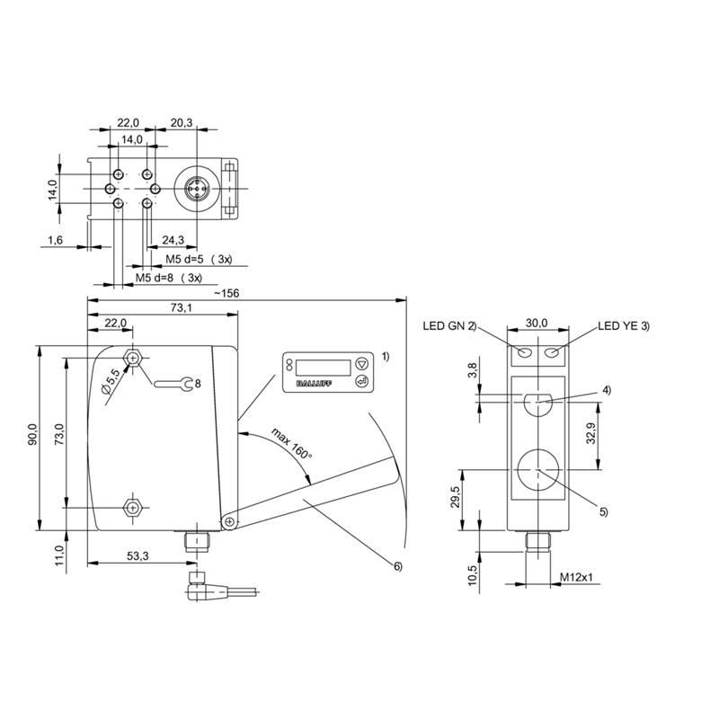 Capteur de mesure de distance; Format: Parallélépipédique; Principe de fonctionnement: Triangulation; Principe de détection Optique divergente; Portée: 100...600 mm; Précision: ±1,5 % P.E.; Fidélité de répétition: 0.5 % FS; Résolution: 100...500 µm; Réglage: Touche (2x); Sortie analogique: Tension 1…10 V; Caractéristique de sortie: Linéaire croissant/décroissant; Taille du spot lumineux: Ø 15 mm à 600 mm; Source d'émission: Laser, Lumière rouge; Sortie de commutation: PNP/NPN; Type de commutation: Contact à fermeture / ouverture (NO/NF); Mode de commutation: Commutation claire / sombre; Raccordement: Connecteur mâle M12, 5 pôles; Tension d'alimentation: 18-30Vdc; Dimensions: 30 x 100,5 x 73,2 mm; Matériau du boîtier: Zinc, moulé sous pression; Classe de protection: IP65; Température ambiante: -20…50 °C; Homologation / conformité: CE, EAC, WEEE; Série: 66M