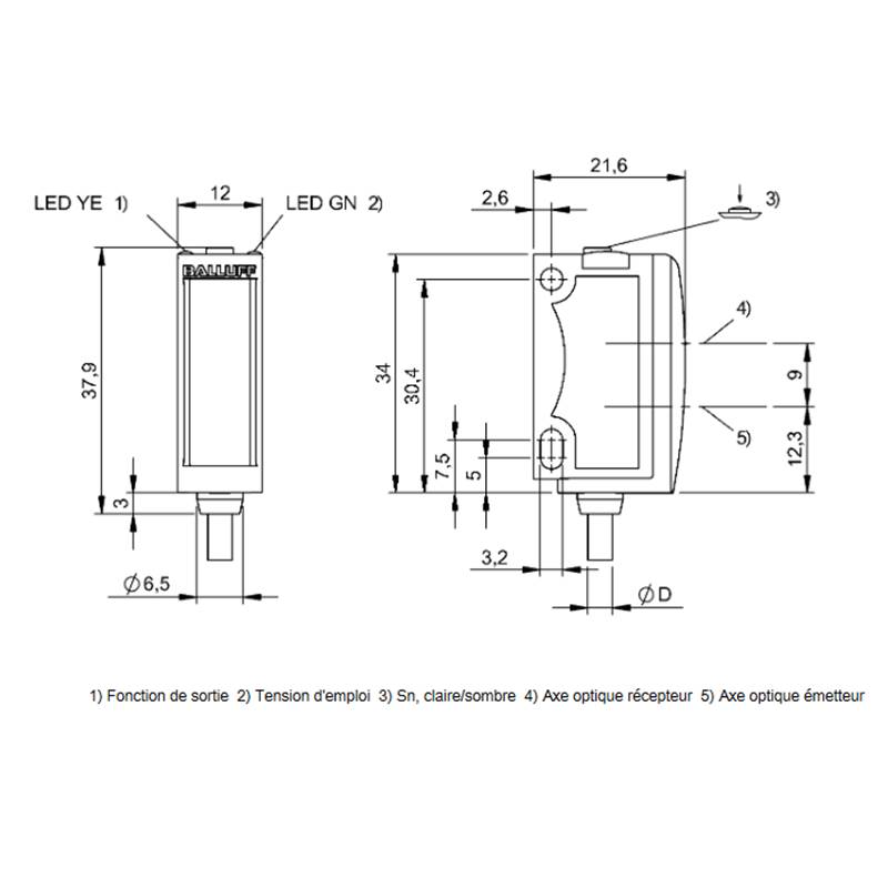Capteur de mesure de distance; Format: Parallélépipédique; Principe de fonctionnement: Détecteur optique, Triangulation; Caractéristique faisceau: Divergent; Portée: 20...80 mm; Résolution: < 120 µm; Sortie analogique: Tension, 1…10 V; Source d'émission: LED, Lumière rouge; Taille du spot lumineux: Ø 5 mm à 50 mm; Sortie de commutation: PNP; Type de commutation: Contact à fermeture / ouverture (NO/NF); Fréquence de commutation: 1000 Hz; Raccordement: Câble, 2.00 m, PVC; Tension d'alimentation: 13-30Vdc; Dimensions: 12 x 37,9 x 21,6 mm; Matériau du boîtier: ABS; Classe de protection: IP67; Température ambiante: 0…45 °C; Série: 6K