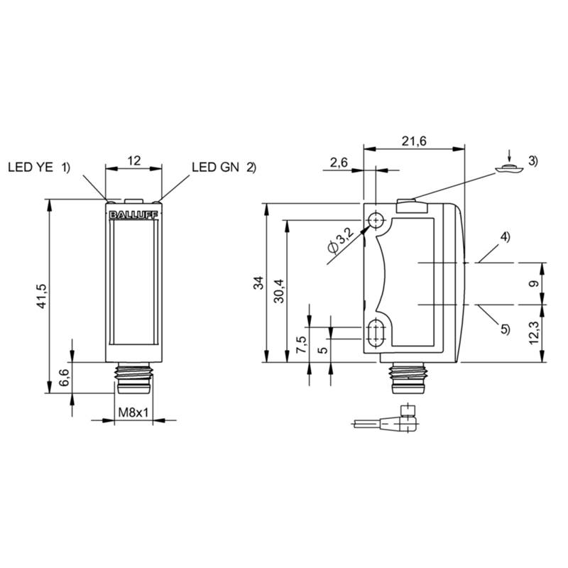 Capteur de mesure de distance; Format: Parallélépipédique; Principe de fonctionnement: Détecteur optique, Triangulation; Caractéristique faisceau: Divergent; Portée: 10...85 mm; Résolution: < 0,15 mm; Sortie analogique: Tension, 1…10 V; Source d'émission: LED, Lumière rouge; Taille du spot lumineux: Ø 5 mm à 50 mm; Sortie de commutation: PNP; Type de commutation: Contact à fermeture / ouverture (NO/NF); Fréquence de commutation: 1000 Hz; Raccordement: Connecteur mâle M8, 4 pôles; Tension d'alimentation: 13-30Vdc; Dimensions: 12 x 37,9 x 21,6 mm; Matériau du boîtier: ABS; Classe de protection: IP67; Température ambiante: 0…45 °C; Série: 6K
