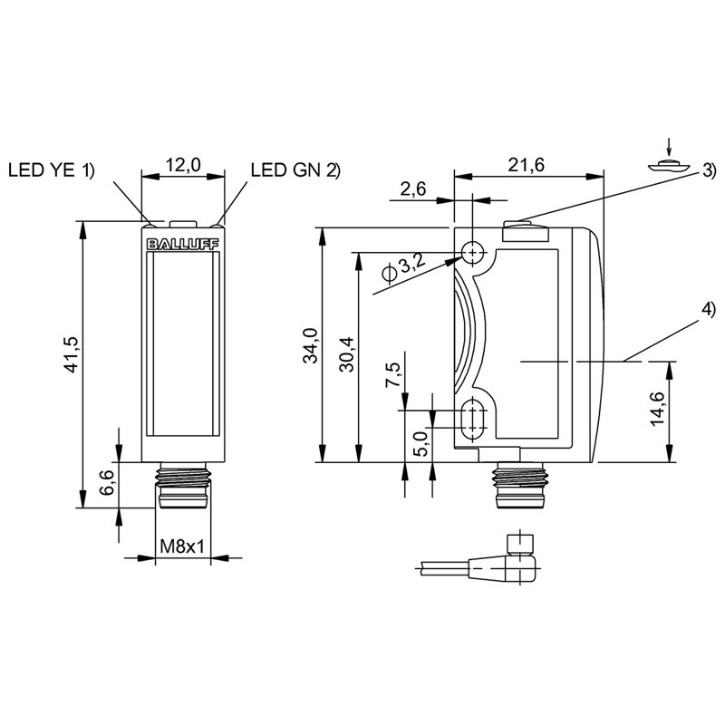 Capteur photoélectrique; Format: Parallélépipédique; Principe du capteur: Barrage optique à réflexion; Principe de détection: Autocollimation; Portée: 0...4 m (BOS R-22); Réglage: Touche d'apprentissage; Source d'émission: Laser, Lumière rouge, Classe 1; Taille du spot lumineux: 4 x 2 mm à 2 m; Sortie de commutation: PNP/NPN; Type de commutation: Contact à fermeture/ouverture (NO/NF); Mode de commutation: Commutation claire/sombre; Fréquence de commutation: 4000 Hz; Interface de communication: IO-Link-Device 1.1.3, COM2 (38,4 kbauds); Raccordement: Connecteur mâle M8, 4 pôles; Tension d'alimentation: 10-30 Vdc; Dimensions: 12 x 34 x 21.6 mm; Matériau du boîtier: ABS; Face sensible, matériau: PMMA; Classe de protection IP67, IP69; Température ambiante: -20…60 °C; Homologation / conformité: CE, UKCA, cULus, WEEE; Série: 6K