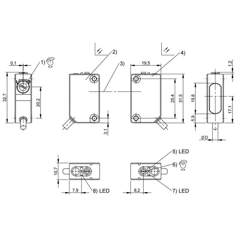 Capteur photoélectrique; Format: Parallélépipédique; Principe du capteur: Barrage optique unidirectionnel; Principe de fonctionnement: Émetteur/Récepteur; Portée Sn: 20 m (0...20 m); Réglage: Potentiomètre 270°; Source d'émission: LED, Lumière rouge; Taille du spot lumineux: Ø 23 mm à 500 mm; Sortie de commutation: PNP; Type de commutation: Contact à fermeture/ouverture (NO/NF); Mode de commutation: Commutation claire/sombre; Temps de réponse: max. 0.5 ms; Fréquence de commutation: 1000 Hz; Interface de communication: -; Raccordement: Câble, 2,00 m, PVC; Tension d'alimentation: 10-30 Vdc; Dimensions: 10.7 x 43.5 x 19.5 mm; Matériau du boîtier: PC, PBT; Face sensible, matériau: PMMA; Classe de protection: IP67 (CEI 60529); Température ambiante -30…55 °C; Homologation / conformité: cULus, CE, UKCA, WEEE; Série: R090K