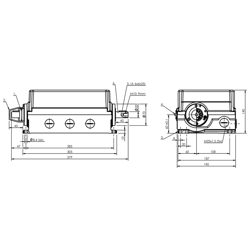 Mécanisme de commutation mécanique; Version: Contact à ressort; Elément de contact (1-12): BSE 44.0; Matériau du contact (1-12): Argent fin, doré; Presse-étoupe, nombre: 5 sorties filetées M25; Bagues à came: (1-12): 180°; Mode d'entraînement: à droite; Vitesse de rotation max.: 200 1/min; Surveillance vitesse de rotation: Sans perte d'éléments de sortie; Tension d'emploi nominale Ue (1-12): 250 VAC; Courant permanent (1-12): 6 A; Dimensions: 305 x 140 x 187 mm; Matériau du boîtier: Aluminium, anodisé; Température ambiante: -5...80 °C; Homologation / conformité: CE, UKCA, CCC, WEEE; Série: 819