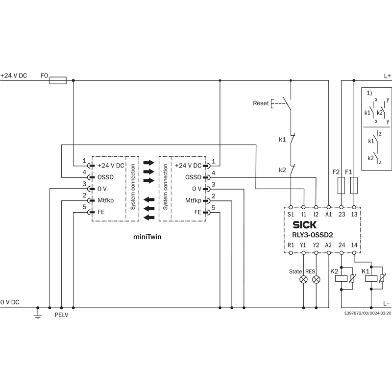 Barrage immatériel de sécurité; Pièce du système: 1 Twin-Stick; Utilisation: miniTwin2 comme appareil en cascade maître ou esclave – pas comme appareil de fin de cascade; Type de fixation: Fixation C-Fix ou L-Fix; Portée: 8 m; Résolution: 34 mm; Hauteur du champ de protection: 420 mm; Raccordement du système: Connecteur mâle M12, 5 pôles; Connecteur d'extension: Connecteur femelle M12, 5 pôles; Série: miniTwin2