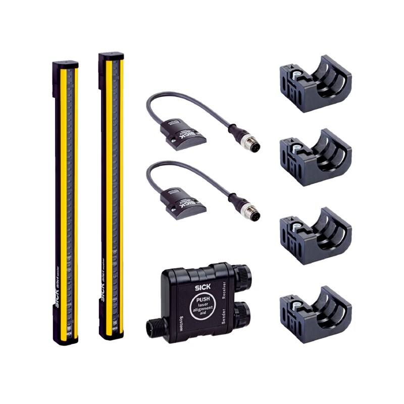 Pack Barrage immatériel de sécurité; Variante deTec : deTec4 Core; Type : Type 4; Pièce du système : Set; Domaine d'utilisation : Environnement industriel standard; Résolution : 30 mm; Portée : 30 m; Hauteur du champ de protection : 300 mm; Raccordement du système : Connecteur systeme 1000 monté; Indice de protection : IP65, IP67; Contenu de la livraison :; 1 x Émetteur C4P-SA03031AA0; 1 x Récepteur C4P-EA03031CA0; 1 x Fixation C-Fix (2068830); 1 x Adaptateur en T avec bouton pour outil d’alignement laser, M12, 5 pôles (2077933); 1 x Plaque d'adaptation FlexFix (2098799)