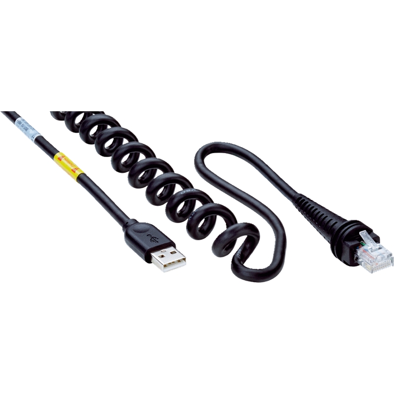 Connecteur / Câble de raccordement; Type: Câble de connexion; Raccordement A: Connecteur USB-A, mâle; Raccordement B: Connecteur RJ45, mâle; Câble: 5 m, câble spiralé; Description: Pour le bouclage de clavier ou l’émulation de port COM USB, Host Power 5 V (Honeywell CBL-500-500-C00), USB