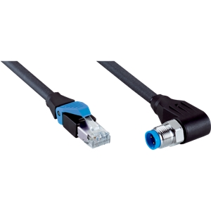 Connecteur / Câble de raccordement; Type : Câble de connexion; Mode de raccordement A : Connecteur M12, mâle, coudé, 4 pôles, codé D; Mode de raccordement B : Connecteur RJ45, mâle, droit, 4 pôles; Câble : 2 m, 4 fils, CAT5, PUR; Domaine d'utilisation : Domaine de l’huile/des lubrifiants, Résistant aux UV, Résistant aux à l’ozone, Outdoor,...